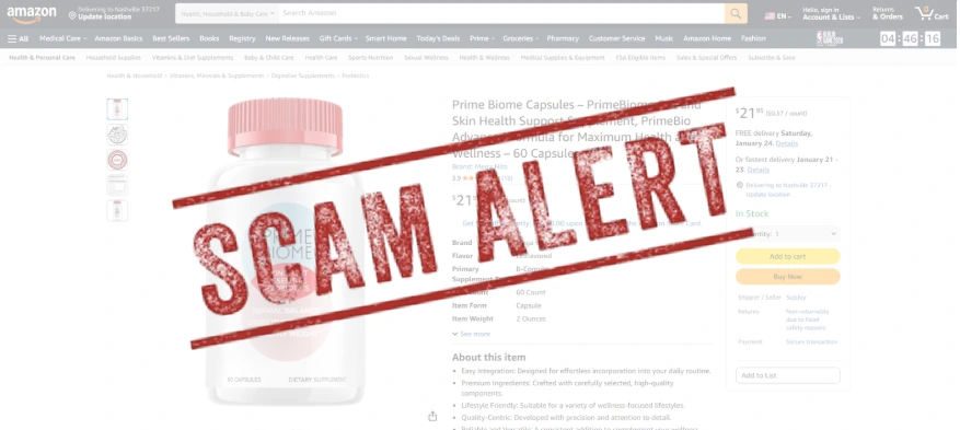 There are many counterfeit products out there! I almost fell for this scam right at the beginning; I saw ads with very low prices on suspicious websites and almost bought it. The original PrimeBiome is only available on the official website (use the secure link from the original video or review page). Avoid Amazon and unknown stores; many people report receiving counterfeit products that are ineffective or worsen their skin condition.